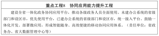 高质效政务运行走在全国前列。建成全省一体化政务协同运行体系,有力支撑和驱动“放管服”改革,畅通直达人民群众和市场主体的服务渠道,实现数字政务与人民群众生产、生活、生态相生相融,政务运行一体事联办完成率达到80%。