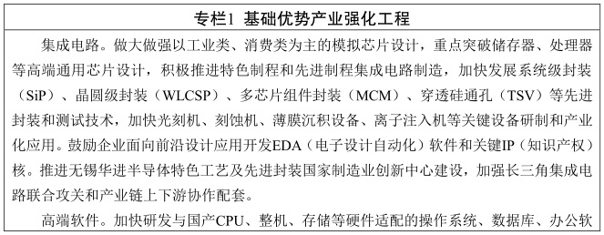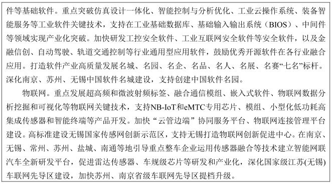 巩固基础优势产业。聚焦集成电路、软件服务、物联网、信息通信等领域,加快实施一批重大工程,壮大链主企业,完善产业链配套,补齐产业链短板,推动数字经济基础优势产业迈向全球价值链中高端。面向制造业重点领域,大力突破一批市场需求大、质量性能差距大、对外依存度高的集成电路核心基础元器件和关键基础材料,提升工业芯片自主研发生产能力。加快制造技术软件化进程,开展基础软件、高端工业软件和核心嵌入式软件等产品协同攻关适配,培育工业软件创新中心,打造全国顶尖的工业软件企业集聚高地,推进制造业产业基础高级化。推进物联网集成创新和规模化应用,形成全球知名的物联网融合应用高地,支持无锡打造物联网创新促进中心。