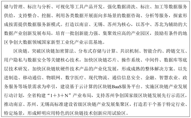 培育数字产业集群。吸引总部企业、核心配套环节和先进要素集聚江苏,加快关键技术攻关及产业化、检验测试平台建设和示范应用,引导整装和零部件企业协同发展,培育世界知名品牌,在集成电路、物联网、核心信息技术等领域打造具有国际竞争力的产业集群。围绕人工智能、区块链、车联网等新兴领域培育一批特色产业集群,以龙头企业为引领,以产业链为纽带,推动产业链上下游精准对接和资源要素集聚,不断完善技术创新、成果转化、检测认证、应用示范、人才培养、产融合作等区域数字产业集群生态。