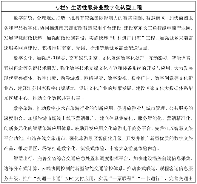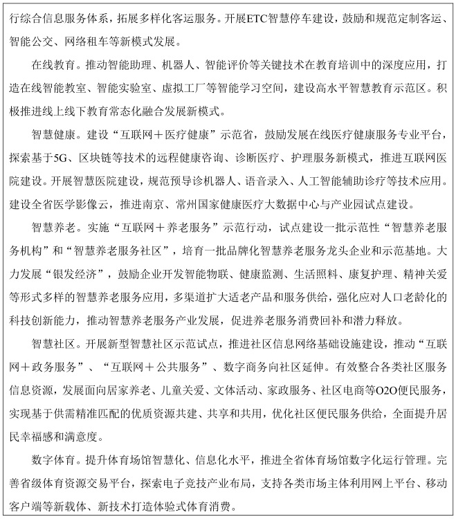 加快发展数字化生活服务业。推动人工智能、大数据、物联网、虚拟现实等新一代信息技术与生活服务的深度融合,丰富商贸流通、文化旅游、健康养老、广播影视、出行、教育、体育等行业智慧化服务供给。扩大消费级无人机、车载智能终端、智能家居、智能安防等新型数字产品消费,鼓励演艺、会展、艺术、动漫、游戏等数字文化消费。拓展数字生活消费空间,联合通信运营商、智能终端生产企业、信息服务提供商建设新型数字消费综合体验中心,加快智慧商圈、智慧街区建设,推进各类特色小镇、园区的信息消费应用示范,支持南京、苏州、无锡深化建设国家综合型信息消费示范城市。