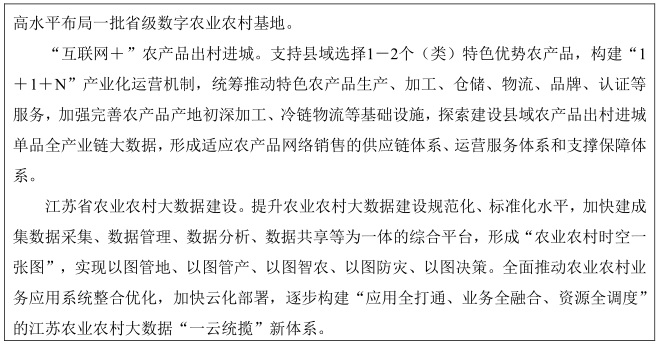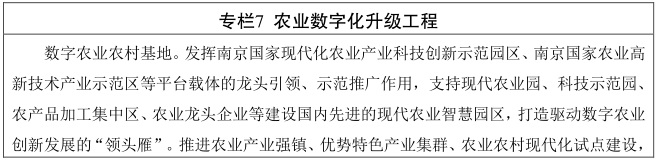 提升农业生产数字化水平。发挥南京国家现代化农业产业科技创新示范园区、南京国家农业高新技术产业示范区等平台载体的引领示范作用,加强数字农业技术装备研发应用,提升高端农机关键技术和核心部件自主可控水平,积极发展农业机器人、农业无人机等农业智能,加快农机智能化升级。实施农业物联网示范工程,促进新一代信息技术与种植业、畜牧业、渔业、农产品加工业等领域深度融合,加快各类农业物联网管理服务平台整合和一体化推广应用,强化数据采集监测、数据挖掘分析和智能决策调控,推动农业环境调控、动植物本体感知、畜禽定量饲喂、水肥一体化喷滴灌、农业航空装备等数字化解决方案在设施农业和大田种植中应用推广。