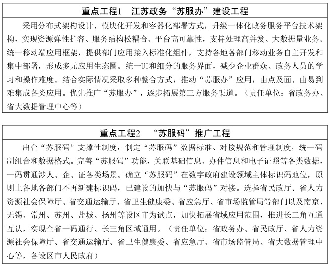 全面推进省市大数据中心建设,形成统一管理、融合共享、保障有力的全省大数据中心体系。建成“苏服办”统一入口,全面推进数字政务三大领域清单改革落地,推动业务流和数据流深度融合,基本完成重点任务、重点工程和重点应用建设,总体实现各类应用入驻“苏服办”。建立健全制度规范、运营运维、安全防控、考核评估等保障措施,保障数字政府一体化建设和安全有序运行。
